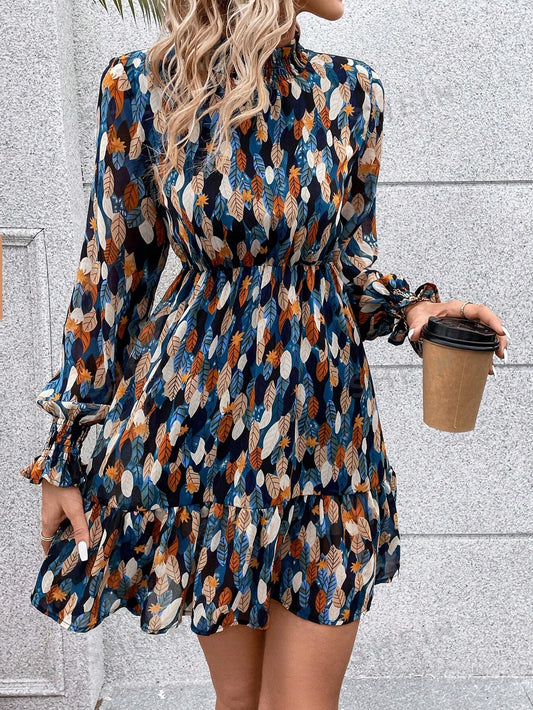Frenchy Allover Print Flounce Sleeve Ruffle Hem Pleated Collar Shirred Dress